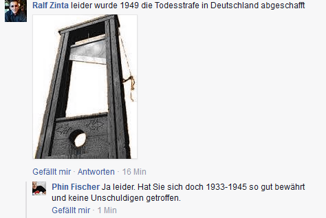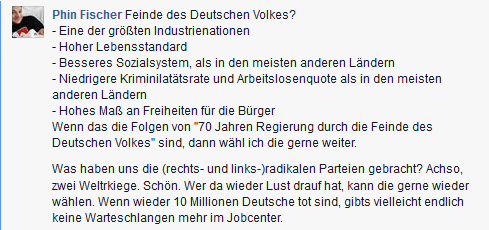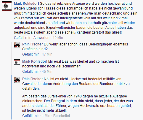 Zum einen sind sie unmoderiert. Jedenfalls für Rechtspopulisten. Ein „linker Gutmensch“ ist auf den meisten Seiten schnell gesperrt. Weist man die Administratoren auf die Hetzkommentare und Beleidigungen hin, bekommt man neben einem müden Lächeln nur ein „Für die Kommentare auf der Seite sind wir nicht verantwortlich“. Diese Argumentation kenne ich bereits, wenn man NPD Politiker darauf hinweist, dass einige ihrer Kameraden straffällig geworden sind. Dann bekommt man auch meist nur die Antwort, das man ja keine Verantwortung dafür übernehmen kann, was NPD-Politiker in ihrer „Freizeit“ machen. Komisch, dass bei Terroranschlägen, kriminellen Ausländern oder schwarzen Schafen in anderen Parteien immer sofort die ganze Gruppe verantwortlich gemacht wird.