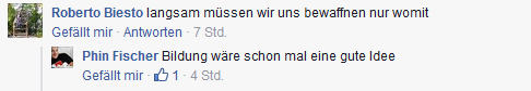 Facebook reagiert nicht auf Meldungen. Wenn die Administratoren der Seite schon nicht reagieren, dann muss doch wenigstens Facebook auf fremdenfeindliche Äußerung reagieren, oder? Falsch gedacht! Sätze wie „Diese scheiß Kanacken sollen von mir aus alle verrecken“ sieht Facebook anscheinend nicht als bedenklich an. Ich habe mittlerweile zahlreichen Beiträge gemeldet, die einen Straftatbestand erfüllen. Facebook hat nach eigenen Angaben alle überprüft, konnte allerdings keinen Verstoß gegen die Richtlinien feststellen. Ja nee, is klar.
