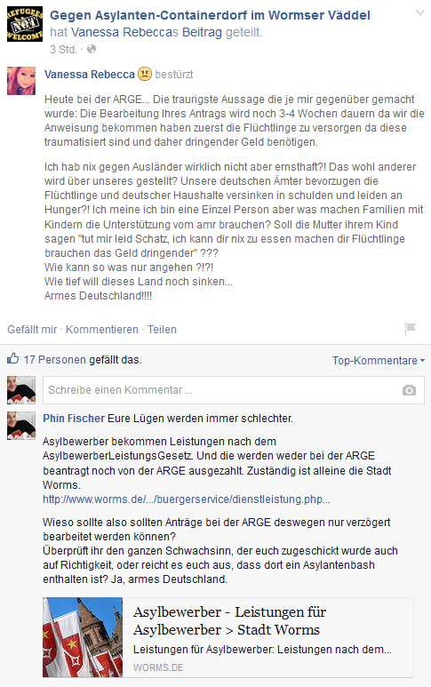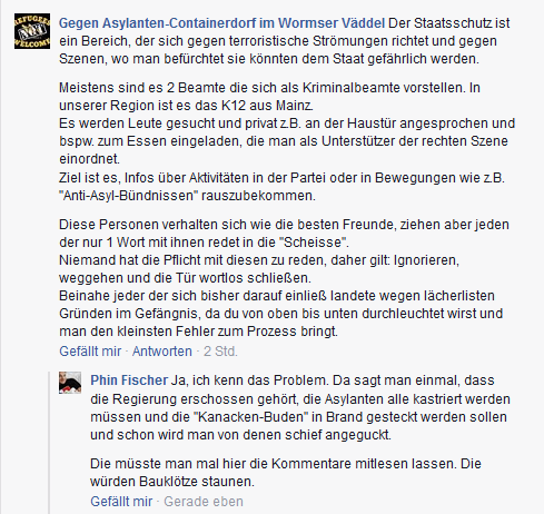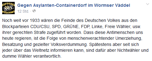 Schaut man sich allerdings die Beiträge der Seitenbetreiber und vieler Kommentatoren an, geht es um diese Problematik schon lange nicht mehr. Da werden Fanseiten zu NPD-Politikern gepostet, jeder Artikel in dem irgendein Moslem mal was böses gemacht hat, geteilt und rechtsextreme Rock- / Rapbands promoted. Am eigentlichen Thema (hier zB. „Gegen das Asylantencontainerdorf im Wormser Väddel„) wird schon seit Monaten vorbeigesprochen. Es reicht wenn jemand oder etwas gegen Ausländer ist.